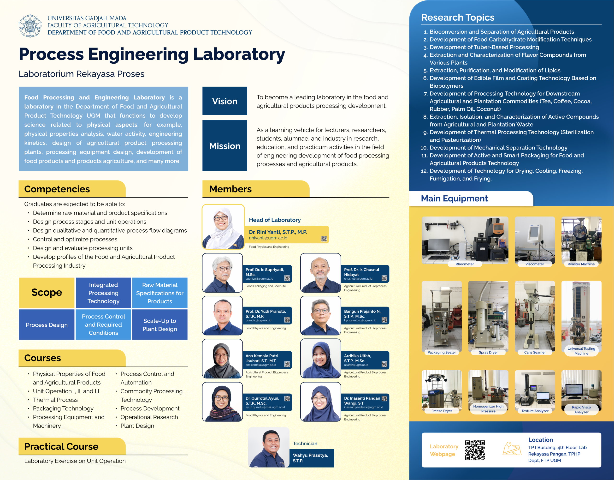 The Laboratory of Process Engineering is a laboratory in the Department of Food and Agricultural Product Technology UGM that develops science related to the physical aspects, for example, physical properties analysis, water activity, engineering kinetics, design of agricultural product processing plants, processing equipment design, development of food and agricultural products, and many more.