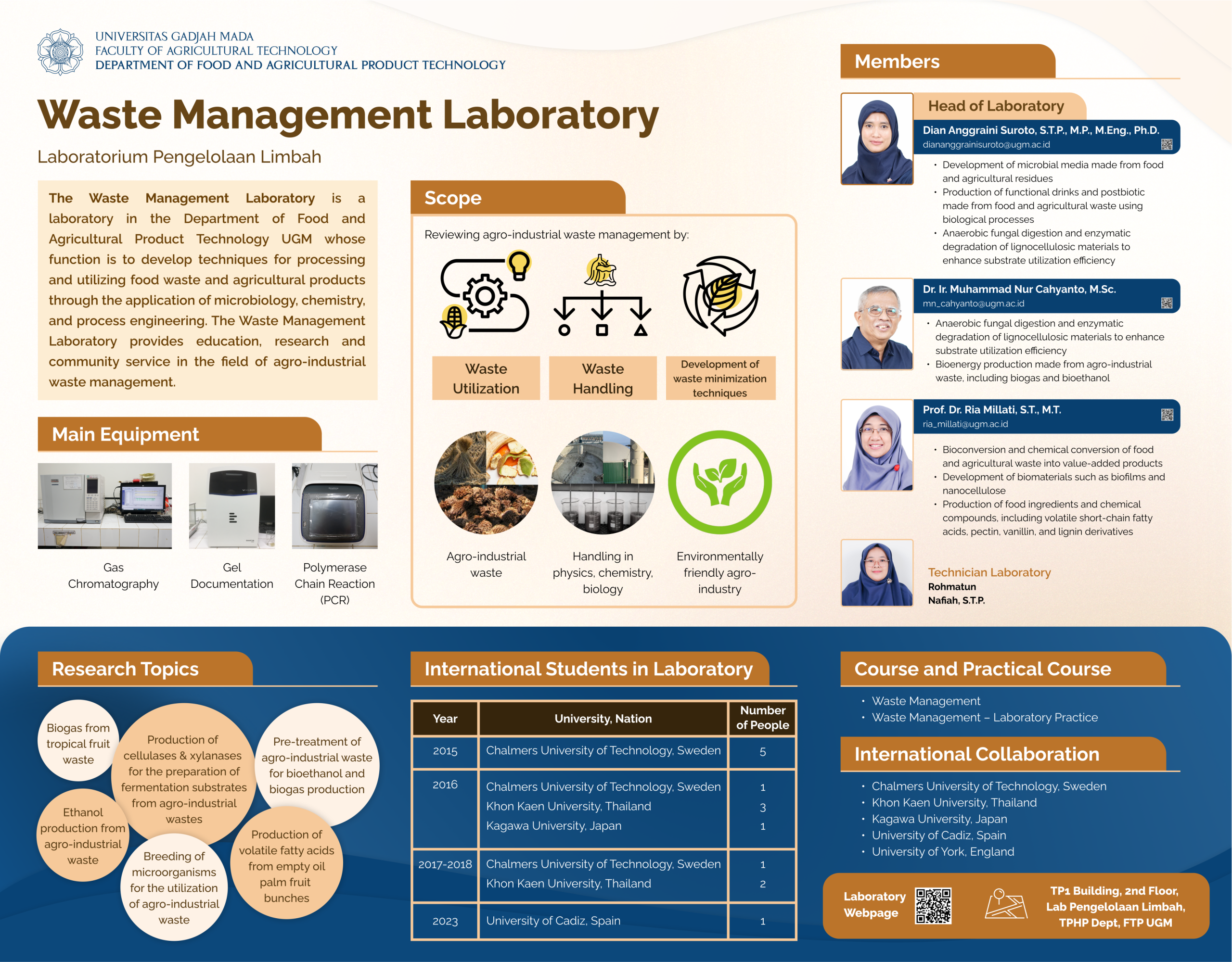 The Waste Management Laboratory is a laboratory in the Department of Food and Agricultural Product Technology UGM whose function is to develop techniques for processing and utilizing food waste and agricultural products through the application of microbiology, chemistry, and process engineering. The Waste Management Laboratory provides education, research and community service in the field of agro-industrial waste management.